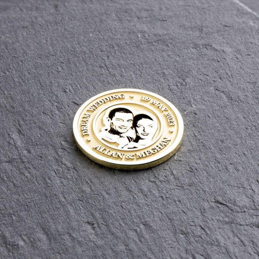 Nuestras monedas personalizadas son el regalo perfecto para un aniversario. Puedes diseñarlas con tu propio texto en el anverso y reverso, y nosotros creamos un grabado personalizado del retrato basado en tu foto de boda. Así, este regalo se convierte en un recuerdo único e inolvidable.