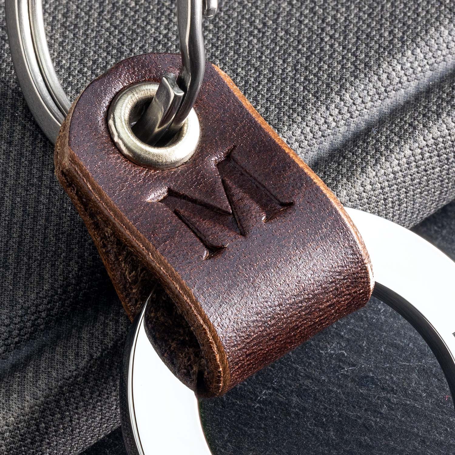 Dieser exquisite Schlüsselanhänger kombiniert die Robustheit von Edelstahl mit der Natürlichkeit von Leder. Verbunden durch einen Edelstahlfederring, bietet er eine sichere und stilvolle Möglichkeit, deine Schlüssel zu tragen. Personalisiere ihn mit deinen Initialen auf der Lederoberfläche und wähle aus einer Palette von 12 Lederfarben, um ihn vollständig auf deinen Stil abzustimmen.